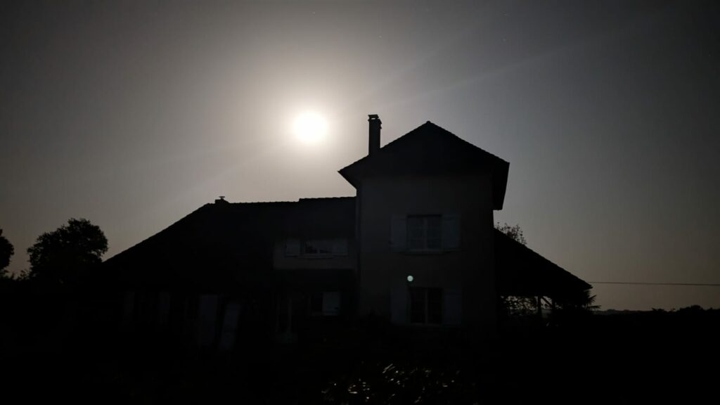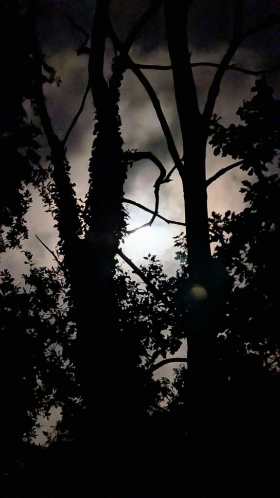 La lune pleine ou quasi pleine à travers les branchages, le brouillard qui tombe, le murmure du ruisseau qui serpente au fond du vallon, le chant de la chouette hulotte dans le bois… « Ce n’est pas tant / ce monde qui me plaît tant, / c’est le mystère qui est dedans »…