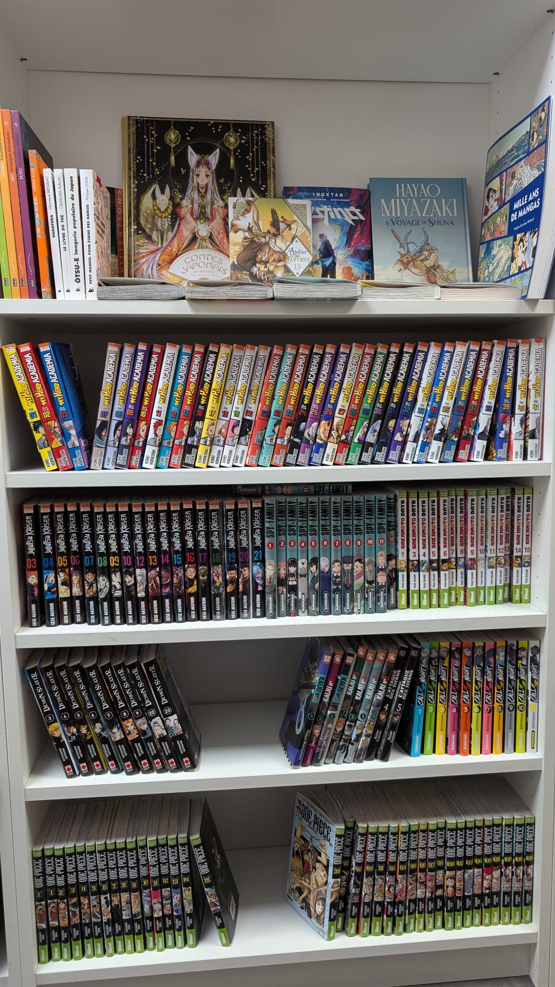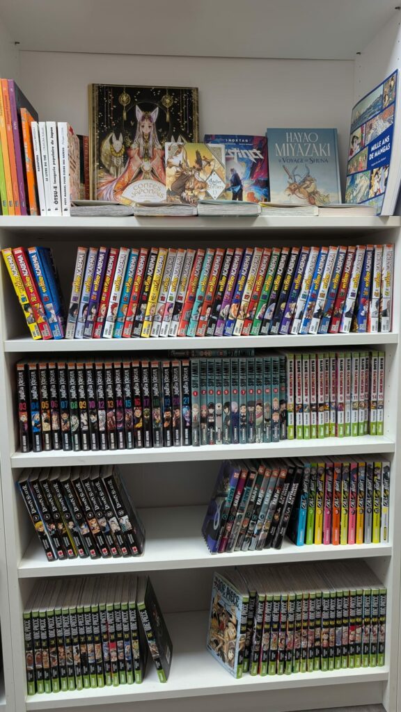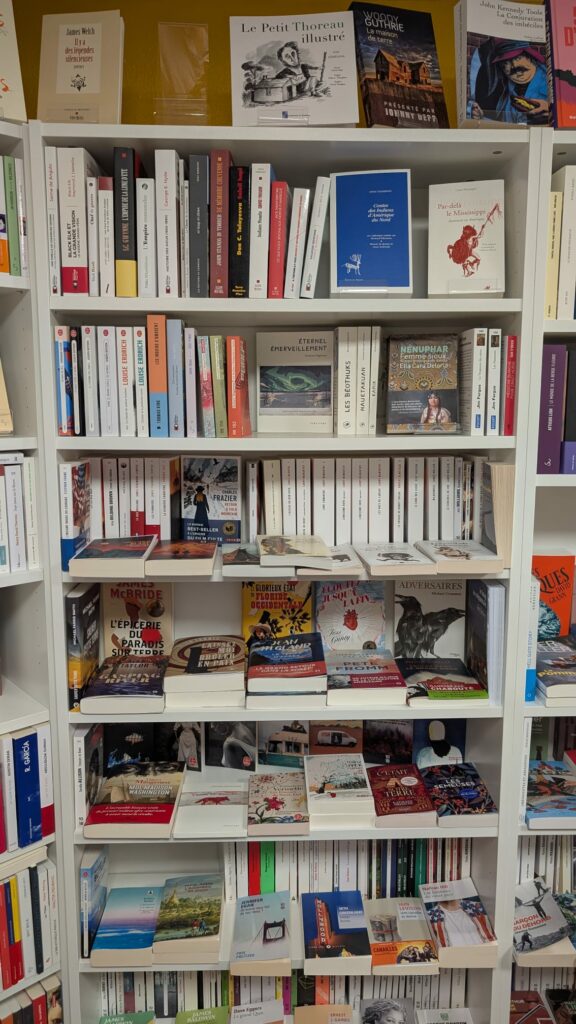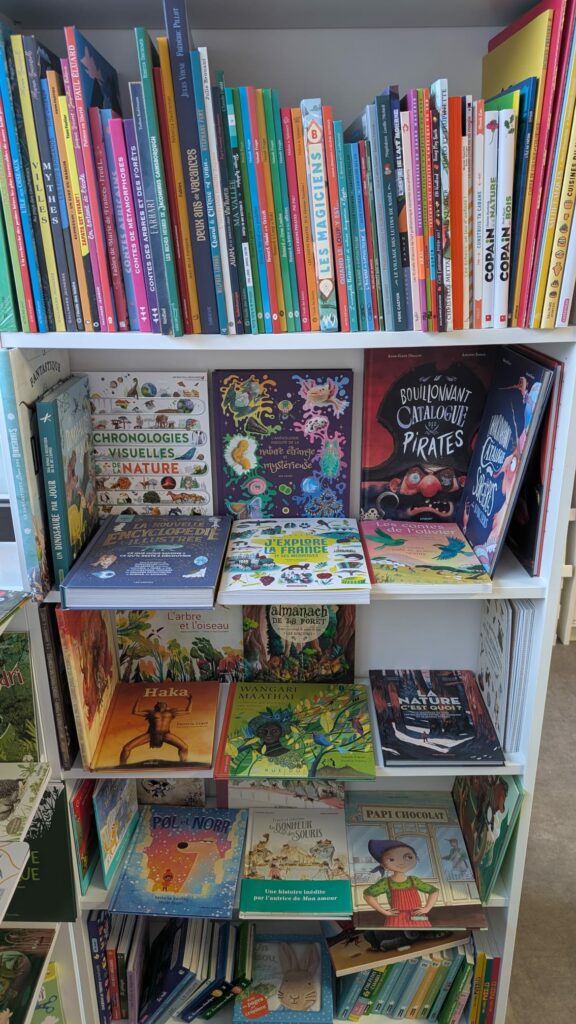 A 7 kilomètres de la maison, Nexon est une petite ville qui compte 2.500 habitants, un cirque permanent, un collège, une médiathèque, et une très chouette librairie / café / bar à vins que je viens enfin de découvrir (alors qu’elle a ouvert il y a trois ans!), grâce à mon amie Muriel qui m’y a emmené ce soir. On y trouve de tout, pour les parents, pour les ados, pour les jeunes enfants: c’est l’endroit idéal pour se retrouver autour d’un verre pendant que les courtes pattes se perdent dans la découverte de nouveaux univers graphiques et littéraires. Le tout avec une qualité de choix assez surprenante pour une si petite ville rurale, et avec au hasard des rayons quelques livres qui m’ont donné un énorme pincement au coeur, car ils ont beaucoup compté pour moi (« Parler pour que les enfants écoutent, écouter pour que les enfants parlent », « Beauté fatale », « Des arbres pour le futur »…)