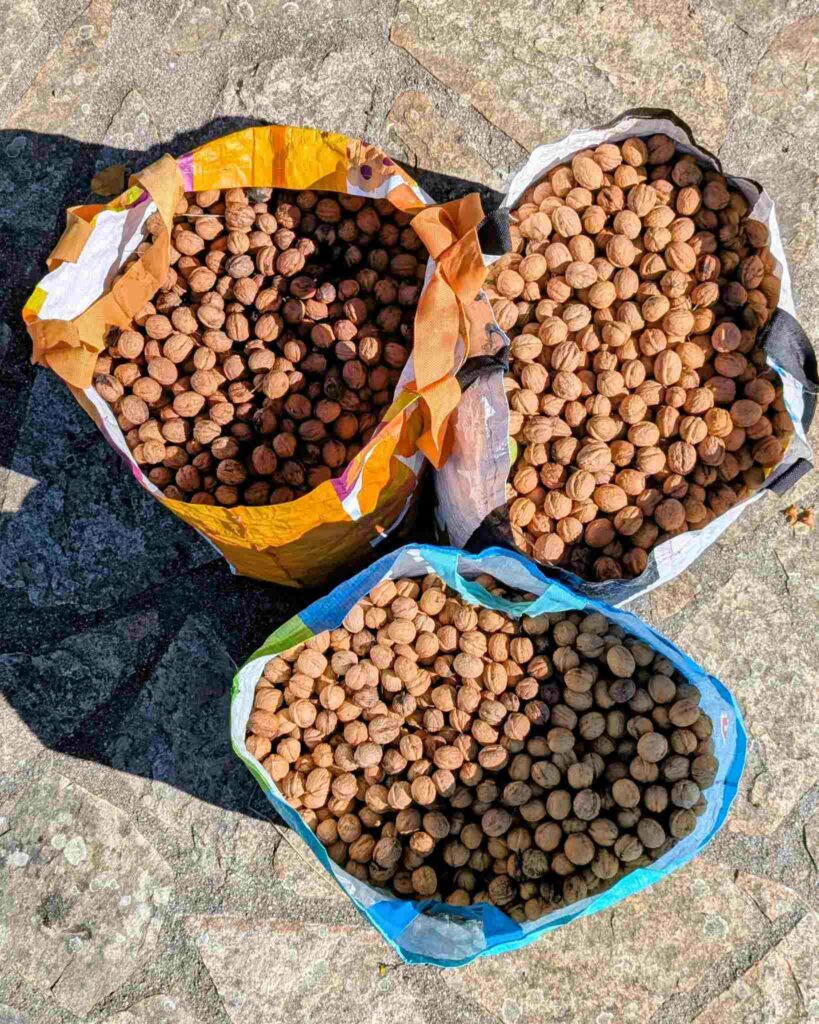 3) La noix est une source de nutriments qui pousse toute seule : le seul travail nécessaire, c’est la récolte (ce qui n’est quand même pas rien, la preuve j’ai passé plus de 3 heures pour ramasser ces 37 kilos), et de la taille si on veut optimiser la production et le calibre des fruits.