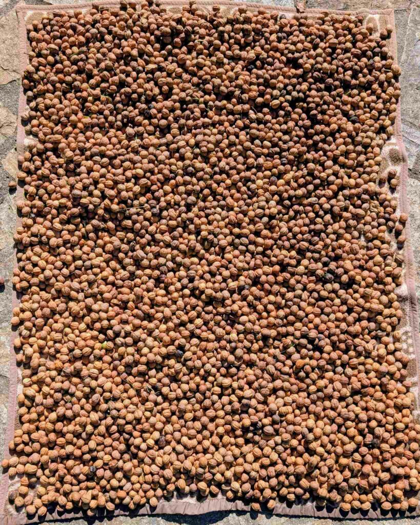 4) La noix est un aliment qui se conserve sans aucune dépense énergétique : pas besoin de mettre en bocaux ou au congélateur, il suffit de sécher quelques jours au soleil pour qu’elles sèchent (on voit sur la photo ci-contre que les cerneaux ont encore besoin d’un peu de maturation), puis de placer les noix à l’abri des rongeurs (ce qui n’est pas forcément simple, personnellement j’ai eu quelques déboires et depuis je les entrepose dans de grandes caisses hermétiques).