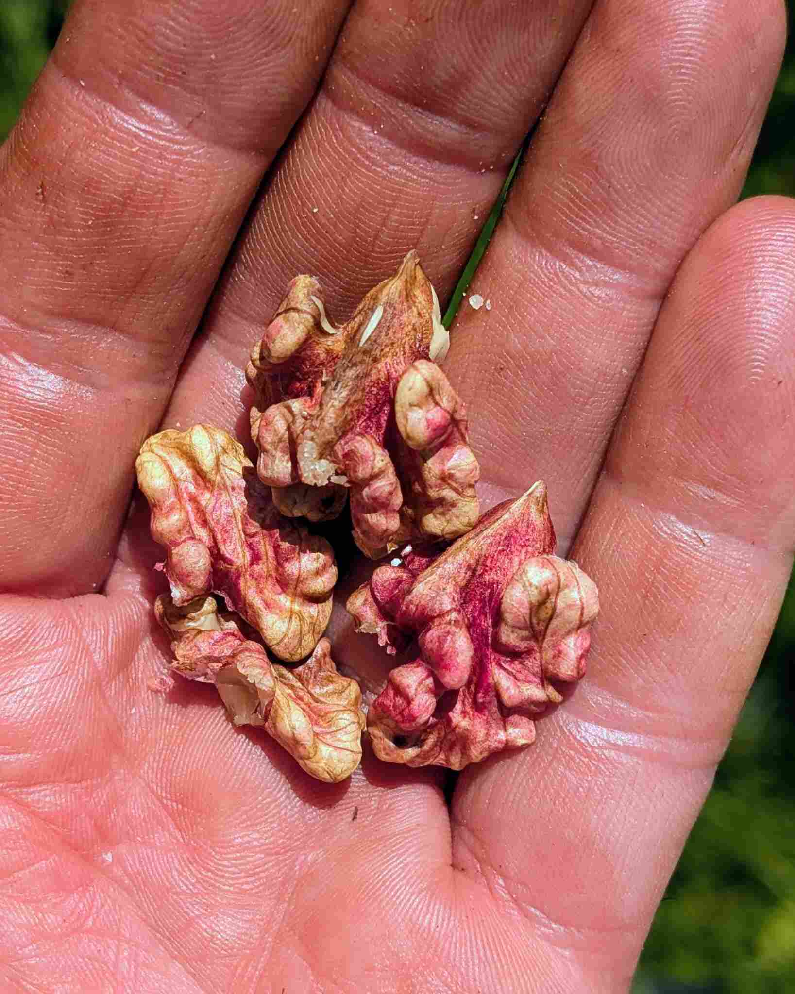 4) La noix est un aliment qui se conserve sans aucune dépense énergétique : pas besoin de mettre en bocaux ou au congélateur, il suffit de sécher quelques jours au soleil pour qu’elles sèchent (on voit sur la photo ci-contre que les cerneaux ont encore besoin d’un peu de maturation), puis de placer les noix à l’abri des rongeurs (ce qui n’est pas forcément simple, personnellement j’ai eu quelques déboires et depuis je les entrepose dans de grandes caisses hermétiques).