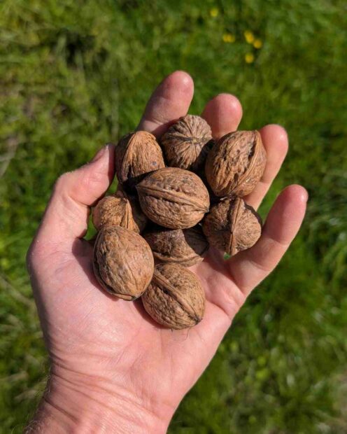 Mais j’ai aussi deux jeunes noyers, que j’ai moi-même plantés à Noël 2016. Ils avaient déjà produit un peu il y a 2 ans, mais cette année la récolte commence à être plus importante, avec une petite centaine de noix, qui sont tout aussi agréables au goût, mais aussi nettement plus grosses car ce sont deux noyers greffés (de variété Franquette). Petite fierté 😎 de pouvoir manger des noix d’arbres qu’on a soi-même plantés!