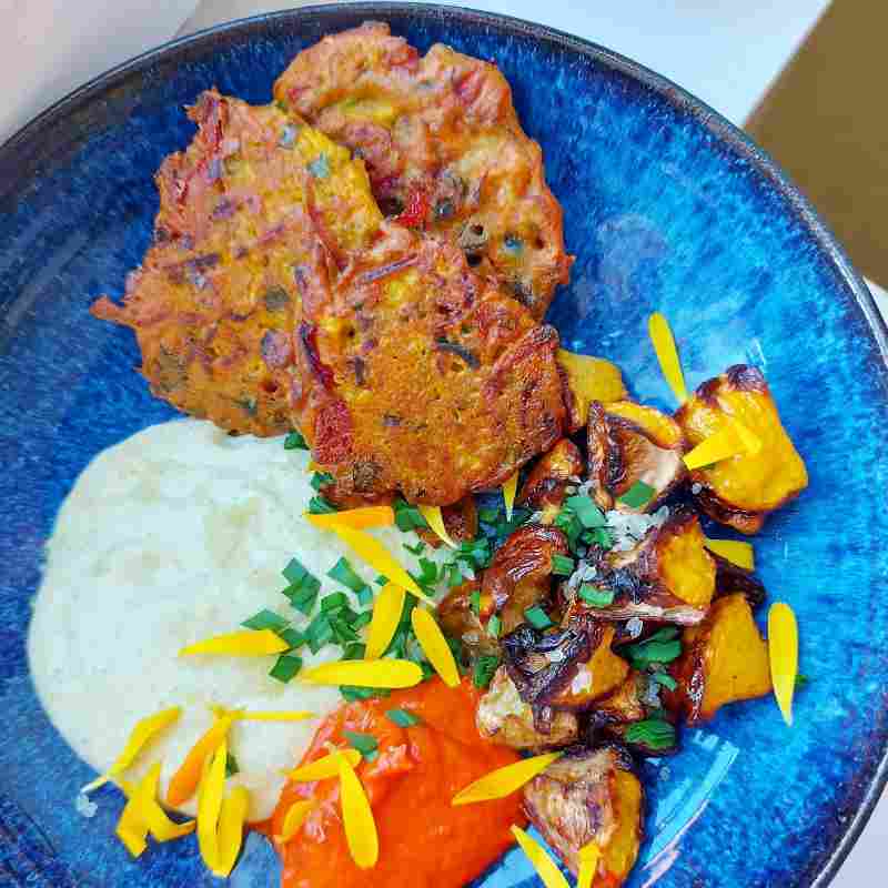 Ci-dessous une photo des galettes d’Elodie, avec son accompagnement de crème de pâtissons et de légumes rôtis. Ça en jette 🤩, à côté ma petite photo d’amateur fait pâle figure 🤭