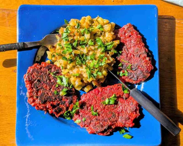 Je m’y suis mis à deux reprises, avec quelques modifications la deuxième fois, et je ne suis pas déçu du résultat. J’ai repris la recette d’Élodie avec quelques adaptations maison. Voici donc (pour deux personnes). Contrairement aux apparences, ce ne sont pas des steaks hachés 😉