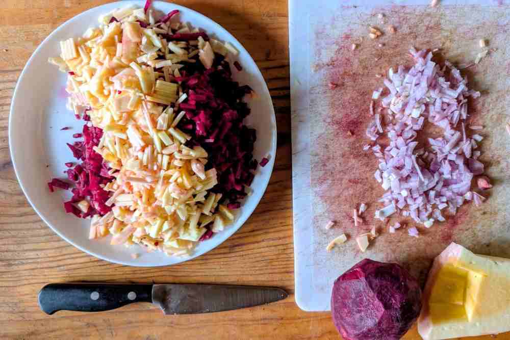 – 300 grammes de légumes de saison coupés en tout petits morceaux. Perso j’ai mis 1/3 de betterave, 1/3 de courgettes, une petite carotte, deux belles échalotes, et un mélange de feuilles de radis daikon et de vert de blettes (je pourrais aussi y mettre du potimarron, des patates douces, du chou kale red russian, du panais…). Je suis certain que l’été ce serait délicieux avec courgettes et poivrons, par exemple.