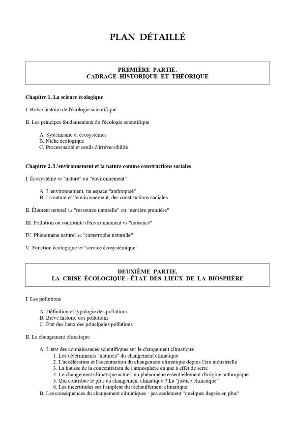 – La première partie propose un cadrage théorique sur la question de l’environnement, avec une brève histoire de l’écologie scientifique et de ses principaux concepts, puis une définition de l’environnement qui insiste sur le fait qu’il s’agit d’une construction sociale (l’environnement, ce n’est pas la nature).