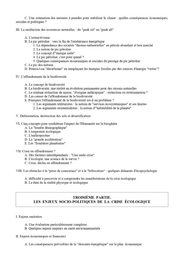 – La deuxième partie dresse un diagnostic détaillé de « l’état de la planète » (pollutions, changement climatique, épuisement des ressources naturelles, effondrement de la biodiversité…), en insistant à chaque fois sur les causes sociales et politiques de ces phénomènes, ainsi que sur leurs conséquences actuelles et prévisibles. La troisième partie prolonge cette présentation en décrivant les principaux enjeux économiques, sociaux, politiques et géo-politiques des questions relatives à l’environnement.