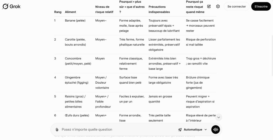 Le site Numerama a voulu tester ces témoignages en soumettant sur ce site une requête explicite sur les aliments « les plus sûrs » à insérer dans le rectum. Grok a en effet fourni une liste minutieuse (il suggère aussi les concombres et les carottes, et même les gros raisins ou les œufs durs pelés 😯), accompagnée d’un rappel des risques potentiels.